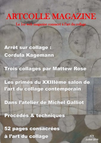 Sommaire du N°9 : Arrêt sur collage, Les primés du 23ème salon du collage, Dans l'atelier de..., Au delà du miroir, Arti-Stick, Sociétal, Art postal, Techniques & procédés, Poésie, Souvenirs d'un proto-bulgare, Extra Extrait, etc. : 52 pages ! format PDF
