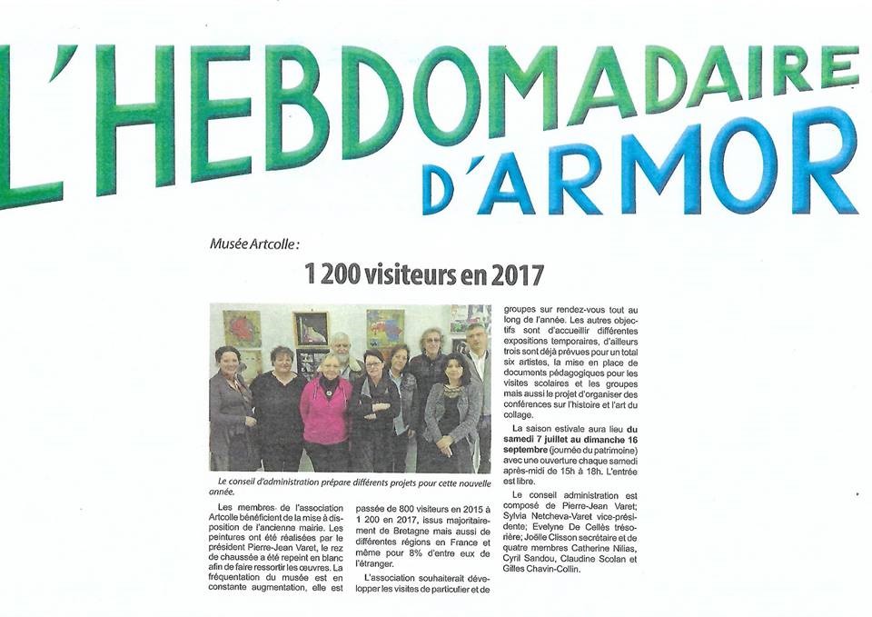 Dans la nouvelle édition du guide touristique du Centre Bretagne cette sympathique photo de Joëlle Clisson et Evelyne De Cellès - nos très actives secrétaire et trésorière de l’association Les amis du musée Artcolle, mes sœurs âmes qui ne comptent pas leurs heures dévouées à la reconnaissance de l’art du collage et de son musée - devant des œuvres de Silvia Netcheva. Il va falloir mettre à jour nos communiqués de presse, puisque à présent la collection permanente du musée compte 200 œuvres exposées, sans compter les deux salles d’expositions temporaires qui seront ouvertes au public dès le 7 juillet prochain. Comme chantait jadis Alain Souchon : « C’est une évidence, on avance, on avance … ».