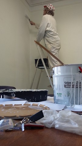 Contrairement aux apparences le printemps sera précoce – pour preuve un vieux chimpanzé de l’espèce bénévolus-collagistikus est remonté sur son escabeau au musée Artcolle. Objectif : ouvrir une seconde salle d’exposition temporaire dès juillet. Merci aux adhérentes & adhérents de l’association Artcolle – grâce à leurs soutient nous avons fait le plein de peinture, et prochainement nous achèterons les rails et cimaises pour cette 5ème nouvelle salle de l’unique musée consacré à l’art du collage.