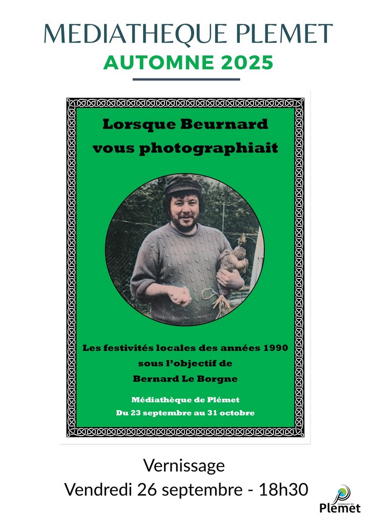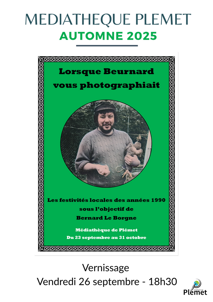 « Lorsque Beurnard vous photographiait » présente une cinquantaine de photographies des festivités plémétaises, ferrandières et prénessayaises des années 1990 prisent par l’objectif de Bernard Le Borgne, dit Beurnard. Réparties en différentes thématiques allant des manifestations associatives à la vie pastorale, des animations municipales aux évènements sportifs, elles dressent un portrait d’un territoire joyeux qui partage le gout du « tous ensemble » à l’aube du XXIe siècle. Cette exposition sera visible du 23 septembre au 31 octobre 2025 à la médiathèque de Plémet.