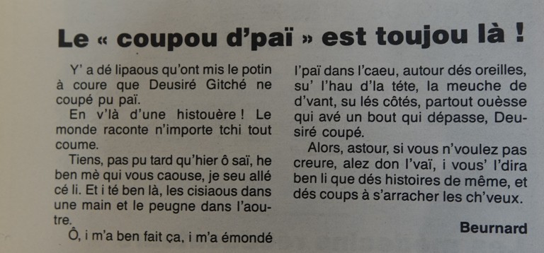 D’aoutes i dis’nt : « ce gars-là, i a dejâ écri su té, dans ieun livr’ d’histouère d’pays ». Ah bôn ? Mé, moué, j’l’ai pas lue c’ti livr’.