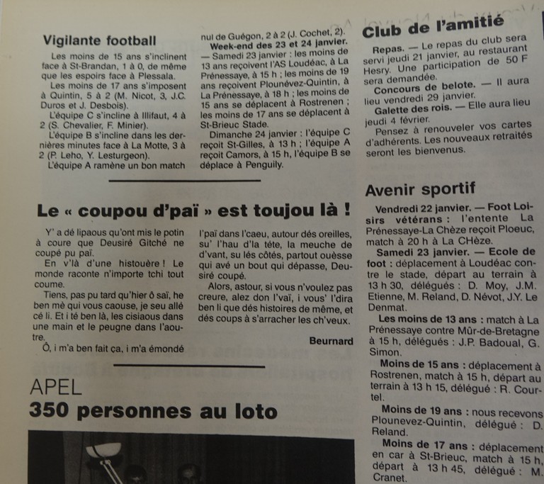 J’ai donc écumé durant plusieurs jours les archives du Courrier Indépendant à la médiathèque de Loudéac, et durant quelques nuits, celles de Ouest-France et du Télégramme sur internet, et pu satisfaire en ton nom ces demandes. Sache que si certaines personnes m’érigent en légataire de tes engagements, cela m’honore à plus d’un titre. Cependant, afin de pouvoir continuer à circuler librement, une question se pose à présent : aurais-tu promis quelques caisses de champagne à l’un de tes nombreux contacts ? Car dans ce cas, je t’implore de me donner au plus vite son identité, afin que je puisse le supprimer de toute liste de rendez-vous. Comme tu le sais, mon cher Bernard, lorsqu’il s’agit de champagne, il ne faut pas pousser le bouchon trop loin !