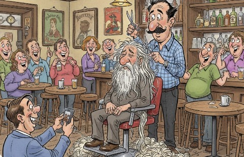 Le défi fut donc lancé. Et, mois après mois, sous le regard médusé de la clientèle, Roland se transforma peu à peu en une sorte de druide échevelé. Bernard, de passage régulier à La Prénessaye, ne manquait jamais de vérifier que son ami respectait scrupuleusement son engagement.